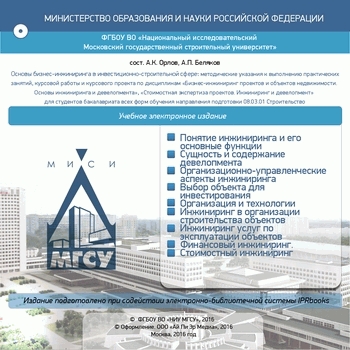 Основы бизнес-инжиниринга в инвестиционно-строительной сфере : методические указания к выполнению практических занятий, курсовой работы и курсового проекта по дисциплинам «Бизнес-инжиниринг проектов и объектов недвижимости. Основы инжиниринга и девелопмента», «Стоимостная экспертиза проектов. Инжиниринг и девелопмент» для студентов бакалавриата всех форм обучения направления подготовки 08.03.01 Строительство / . — Москва : Московский государственный строительный университет, Ай Пи Эр Медиа, ЭБС АСВ, 2016. — 70 c. — ISBN 978-5-7264-1388-4. — Текст : электронный // Цифровой образовательный ресурс IPR SMART : [сайт]. — URL: https://www.iprbookshop.ru/58232.html (дата обращения: 05.12.2025). — Режим доступа: для авторизир. пользователей