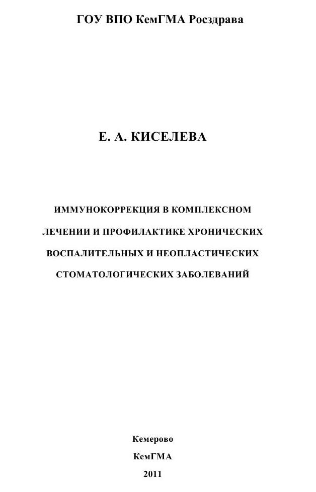 Киселева, Е. А. Иммунокоррекция в комплексном лечении и профилактике хронических воспалительных и неопластических стоматологических заболеваний : монография / Е. А. Киселева. — Кемерово : Кемеровская государственная медицинская академия, 2011. — 171 c. — ISBN 978-5-8151-0048-0. — Текст : электронный // Цифровой образовательный ресурс IPR SMART : [сайт]. — URL: https://www.iprbookshop.ru/6048.html (дата обращения: 20.10.2025). — Режим доступа: для авторизир. пользователей
