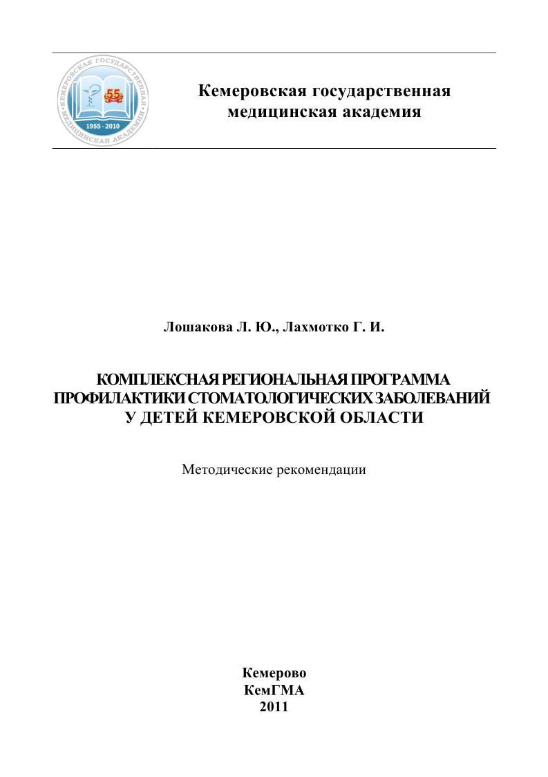 Лошакова, Л. Ю. Комплексная региональная программа профилактики стоматологических заболеваний у детей Кемеровской области : методические рекомендации / Л. Ю. Лошакова, Г. И. Лахмотко. — Кемерово : Кемеровская государственная медицинская академия, 2011. — 40 c. — Текст : электронный // Цифровой образовательный ресурс IPR SMART : [сайт]. — URL: https://www.iprbookshop.ru/6053.html (дата обращения: 09.08.2025). — Режим доступа: для авторизир. пользователей