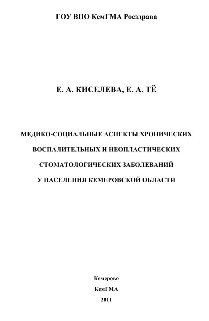 Киселева Е.А. Медико-социальные аспекты хронических воспалительных и неопластических стоматологических заболеваний у населения Кемеровской области : монография / Киселева Е.А., Тё Е.А.. — Кемерово : Кемеровская государственная медицинская академия, 2010. — 114 c. — ISBN 978-5-8151-0047-3. — Текст : электронный // Цифровой образовательный ресурс IPR SMART : [сайт]. — URL: https://www.iprbookshop.ru/6058.html (дата обращения: 05.12.2025). — Режим доступа: для авторизир. пользователей