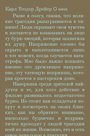 Теодор, Дрейер О кино : статьи и интервью / Карл Дрейер Теодор ; перевод Е. Краснова, П. Каштанов. — Москва : Новое издательство, 2016. — 256 c. — ISBN 978-5-98379-207-4. — Текст : электронный // Цифровой образовательный ресурс IPR SMART : [сайт]. — URL: https://www.iprbookshop.ru/60755.html (дата обращения: 10.03.2025). — Режим доступа: для авторизир. пользователей