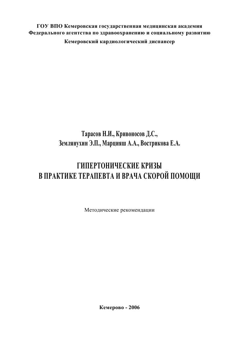 Тарасов Н.И. Гипертонические кризы в практике терапевта и врача скорой помощи : методические рекомендации / Тарасов Н.И., Кривоносов Д.С., Землянухин Э.П.. — Кемерово : Кемеровская государственная медицинская академия, 2006. — 32 c. — Текст : электронный // Цифровой образовательный ресурс IPR SMART : [сайт]. — URL: https://www.iprbookshop.ru/6115.html (дата обращения: 14.12.2025). — Режим доступа: для авторизир. пользователей