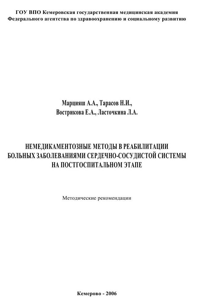 Марцияш А.А. Немедикаментозные методы в реабилитации больных заболеваниями сердечно-сосудистой системы на постгоспитальном этапе : методические рекомендации / Марцияш А.А., Тарасов Н.И., Вострикова Е.А.. — Кемерово : Кемеровская государственная медицинская академия, 2006. — 28 c. — Текст : электронный // Цифровой образовательный ресурс IPR SMART : [сайт]. — URL: https://www.iprbookshop.ru/6167.html (дата обращения: 06.12.2025). — Режим доступа: для авторизир. пользователей