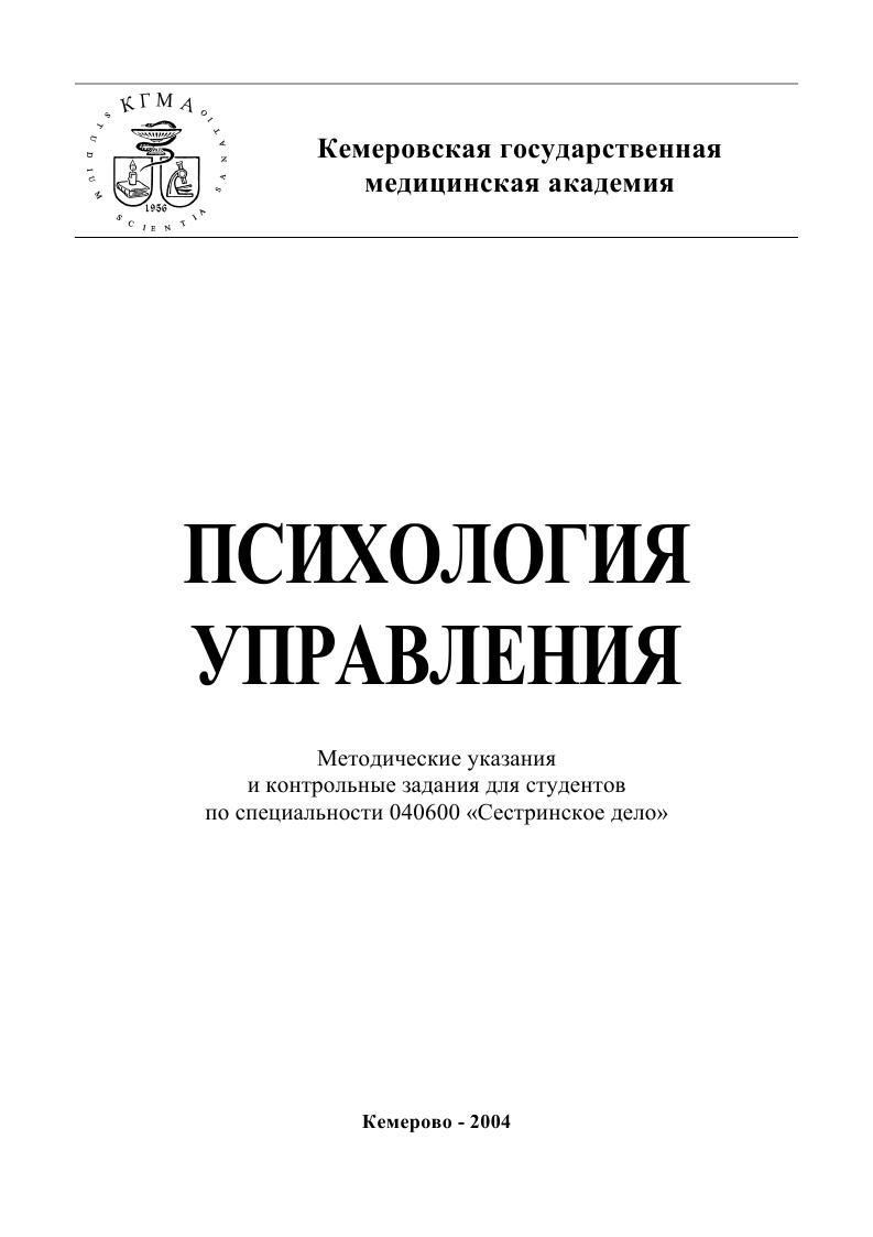 Методические рекомендации по курсу «Психология управления» составлены в соответствии с Государственным стандартом РФ по высшей школе для студентов Кемеровской государственной медицинской академии. В Рекомендациях представлены программа курса «Психология управления» и рекомендации по его изучению. Пособие содержит практические задания и вопросы для самопроверки, варианты контрольных работ, требования к их содержанию и оформлению, список рекомендованной литературы.