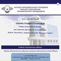 Шульгатый О.Л. Оценка стоимости бизнеса : учебная программа дисциплины для студентов, обучающихся по направлению 38.03.01 «Экономика», профиль подготовки «Финансы и кредит» / Шульгатый О.Л.. — Краснодар, Саратов : Южный институт менеджмента, Ай Пи Эр Медиа, 2017. — 84 c. — Текст : электронный // Цифровой образовательный ресурс IPR SMART : [сайт]. — URL: https://www.iprbookshop.ru/62645.html (дата обращения: 05.12.2025). — Режим доступа: для авторизир. пользователей
