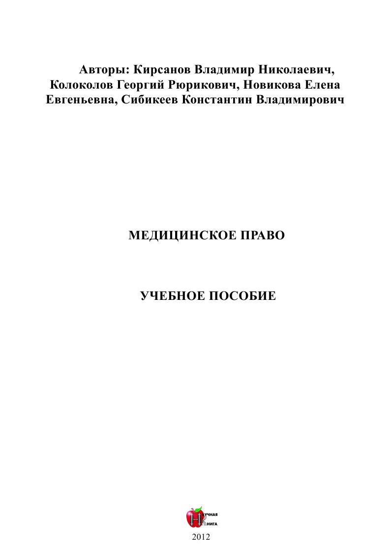 Медицинское право : учебное пособие / В. Н. Кирсанов, Г. Р. Колоколов, Е. Е. Новикова, К. В. Сибикеев. — Саратов : Научная книга, 2012. — 82 c. — Текст : электронный // Цифровой образовательный ресурс IPR SMART : [сайт]. — URL: https://www.iprbookshop.ru/6301.html (дата обращения: 28.04.2025). — Режим доступа: для авторизир. пользователей