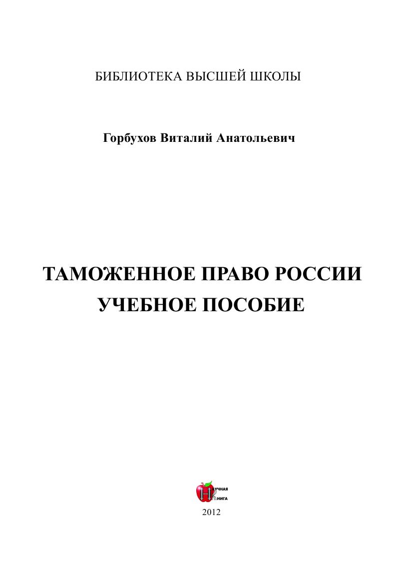 Горбухов, В. А. Таможенное право России : учебное пособие / В. А. Горбухов. — Саратов : Научная книга, 2012. — 178 c. — Текст : электронный // Цифровой образовательный ресурс IPR SMART : [сайт]. — URL: https://www.iprbookshop.ru/6342.html (дата обращения: 29.09.2025). — Режим доступа: для авторизир. пользователей