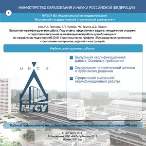 Выпускная квалификационная работа. Подготовка, оформление и защита : методические указания к подготовке выпускной квалификационной работы для обучающихся по направлению подготовки 08.03.01 Строительство по профилю «Производство и применение строительных материалов, изделий и конструкций» / . — Москва : Московский государственный строительный университет, Ай Пи Эр Медиа, ЭБС АСВ, 2017. — 143 c. — ISBN 978-5-7264-1500-0. — Текст : электронный // Цифровой образовательный ресурс IPR SMART : [сайт]. — URL: https://www.iprbookshop.ru/64533.html (дата обращения: 05.12.2025). — Режим доступа: для авторизир. пользователей