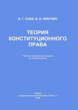 Баев, В. Г. Теория конституционного права : учебное пособие / В. Г. Баев, В. В. Никулин. — Тамбов : Тамбовский государственный технический университет, ЭБС АСВ, 2015. — 82 c. — ISBN 978-5-8265-1422-1. — Текст : электронный // Цифровой образовательный ресурс IPR SMART : [сайт]. — URL: https://www.iprbookshop.ru/64588.html (дата обращения: 16.02.2024). — Режим доступа: для авторизир. пользователей