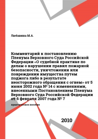 Любавина, М. А. Комментарий к постановлению Пленума Верховного Суда Российской Федерации «О судебной практике по делам о нарушении правил пожарной безопасности, уничтожении или повреждении имущества путем поджога либо в результате неосторожного обращения с огнем» от 5 июня 2002 года № 14 с изменениями, внесенными Постановлением Пленума Верховного Суда Российской Федерации от 6 февраля 2007 года № 7 / М. А. Любавина ; под редакцией А. Н. Попов. — Санкт-Петербург : Санкт-Петербургский юридический институт (филиал) Академии Генеральной прокуратуры РФ, 2010. — 30 c. — Текст : электронный // Цифровой образовательный ресурс IPR SMART : [сайт]. — URL: https://www.iprbookshop.ru/65452.html (дата обращения: 01.08.2025). — Режим доступа: для авторизир. пользователей
