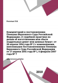 Рогатых, Л. Ф. Комментарий к постановлению Пленума Верховного Суда Российской Федерации «О судебной практике по делам об изготовлении или сбыте поддельных денег или ценных бумаг» от 28 апреля 1994 года № 2 с изменениями, внесенными Постановлениями Пленума Верховного Суда Российской Федерации от 17 апреля 2001 года № 1, 6 февраля 2007 года № 7 / Л. Ф. Рогатых ; под редакцией А. Н. Попов. — Санкт-Петербург : Санкт-Петербургский юридический институт (филиал) Академии Генеральной прокуратуры РФ, 2010. — 12 c. — Текст : электронный // Цифровой образовательный ресурс IPR SMART : [сайт]. — URL: https://www.iprbookshop.ru/65471.html (дата обращения: 01.08.2025). — Режим доступа: для авторизир. пользователей