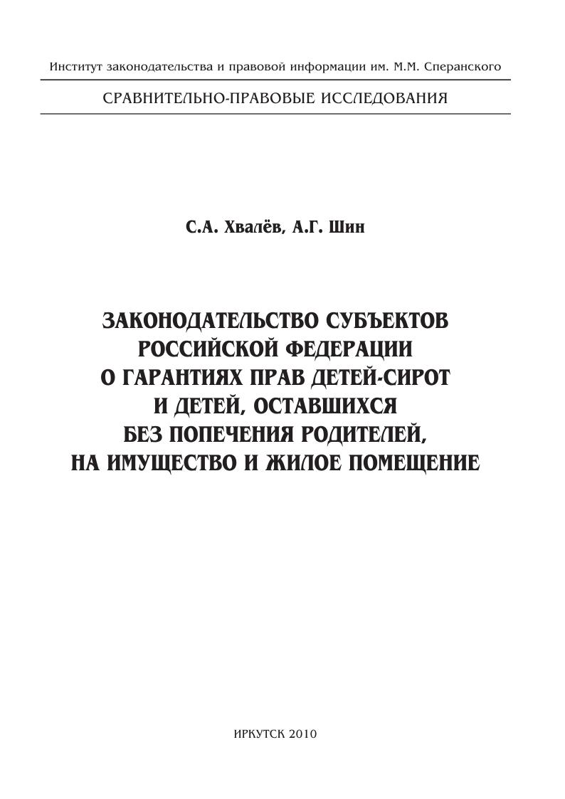 Хвалёв, С. А. Законодательство субъектов Российской Федерации о гарантиях прав детей-сирот и детей, оставшихся без попечения родителей, на имущество и жилое помещение : монография / С. А. Хвалёв, А. Г. Шин. — Иркутск : Институт законодательства и правовой информации им. М.М. Сперанского, 2010. — 48 c. — Текст : электронный // Цифровой образовательный ресурс IPR SMART : [сайт]. — URL: https://www.iprbookshop.ru/6605.html (дата обращения: 04.07.2025). — Режим доступа: для авторизир. пользователей