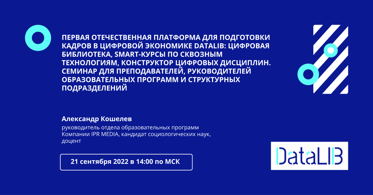 21 сентября в 14:00 (МСК) состоится вебинар «Первая отечественная платформа для подготовки кадров в цифровой экономике DataLIB: цифровая библиотека, SMART-курсы по сквозным технологиям, конструктор цифровых дисциплин. Семинар для преподавателей, руководителей образовательных программ и структурных подразделений».