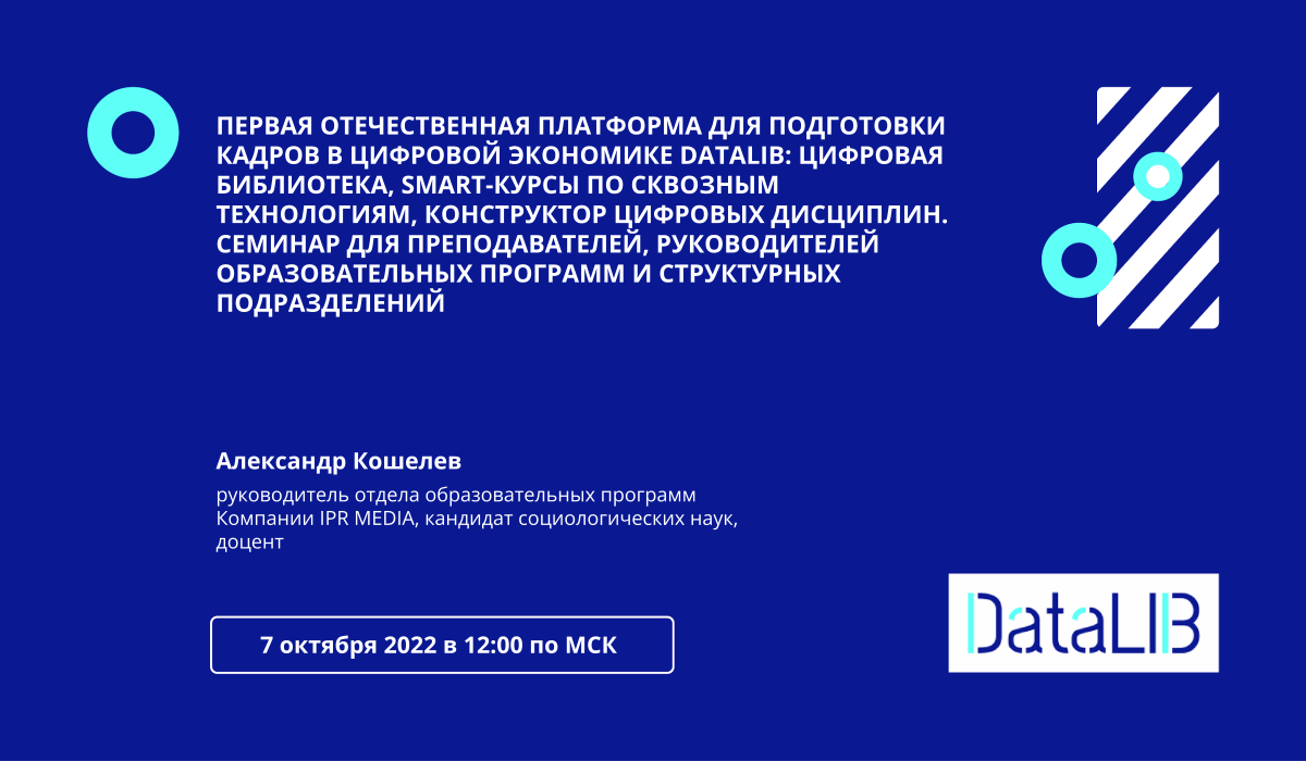 7 октября в 12:00 (МСК) состоится вебинар «Первая отечественная платформа для подготовки кадров в цифровой экономике DataLIB: цифровая библиотека, SMART-курсы по сквозным технологиям, конструктор цифровых дисциплин. Семинар для преподавателей, руководителей образовательных программ и структурных подразделений».