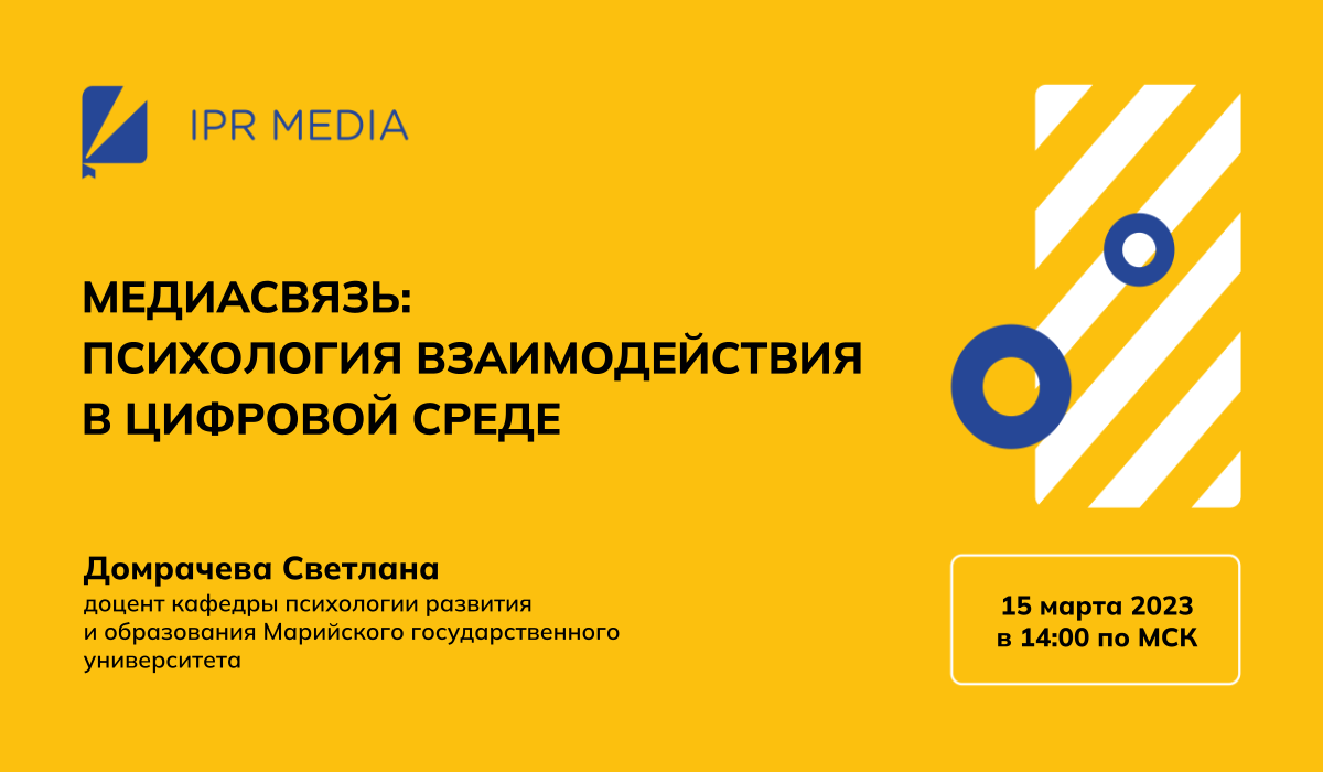 15 марта в 14.00 по Мск приглашаем на вебинар «Медиасвязь: Психология взаимодействия в цифровой среде». Спикером выступит Домрачева Светлана Алексеевна – доцент кафедры психологии развития и образования Марийского государственного университета.