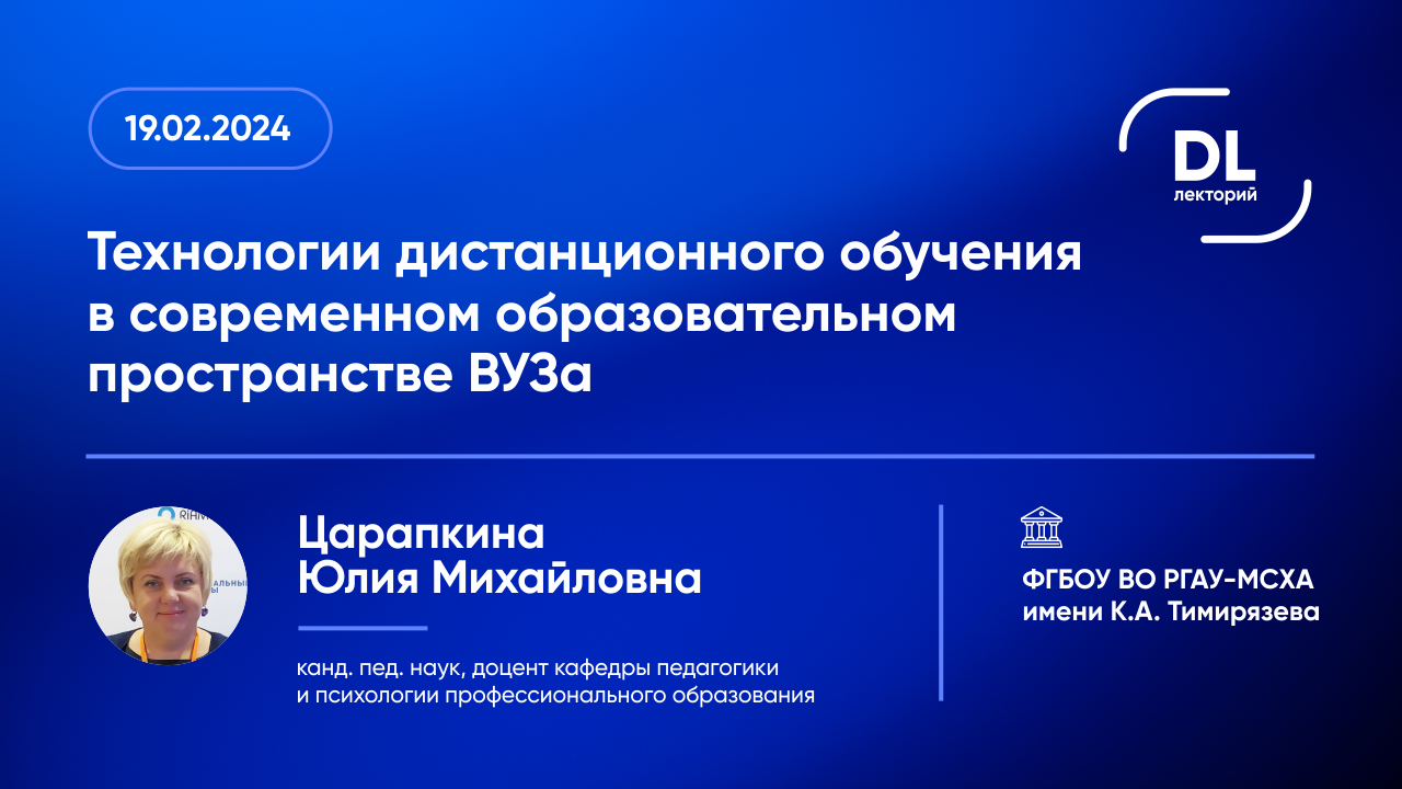19 февраля Тема: Технологии дистанционного обучения в современном образовательном пространстве ВУЗа Лектор: Царапкина Юлия Михайловна, канд. пед. наук, доцент кафедры педагогики и психологии профессионального образования РГАУ-МСХА имени К.А. Тимирязева Лекция начнется в 14.00 (Мск). Регистрация доступна по ссылке: https://us06web.zoom.us/meeting/register/tZAsdeqhrD4oHtZpcB1EDDwH9aiPgw7MB4_9