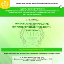 Тимец, М. В. Правовое регулирование волонтерской деятельности : монография / М. В. Тимец. — Москва, Саратов : Всероссийский государственный университет юстиции (РПА Минюста России), Ай Пи Эр Медиа, 2016. — 128 c. — ISBN 978-5-00094-344-1. — Текст : электронный // Цифровой образовательный ресурс IPR SMART : [сайт]. — URL: https://www.iprbookshop.ru/68907.html (дата обращения: 02.03.2025). — Режим доступа: для авторизир. пользователей