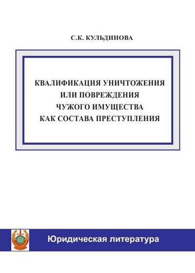 Кульдинова, С. К. Квалификация уничтожения или повреждения чужого имущества как состава преступления : учебное пособие / С. К. Кульдинова. — Алматы : Нур-Принт, Алматинская академия МВД Республики Казахстан, 2012. — 107 c. — ISBN 978-601-7336-33-2. — Текст : электронный // Цифровой образовательный ресурс IPR SMART : [сайт]. — URL: https://www.iprbookshop.ru/69112.html (дата обращения: 15.09.2024). — Режим доступа: для авторизир. пользователей