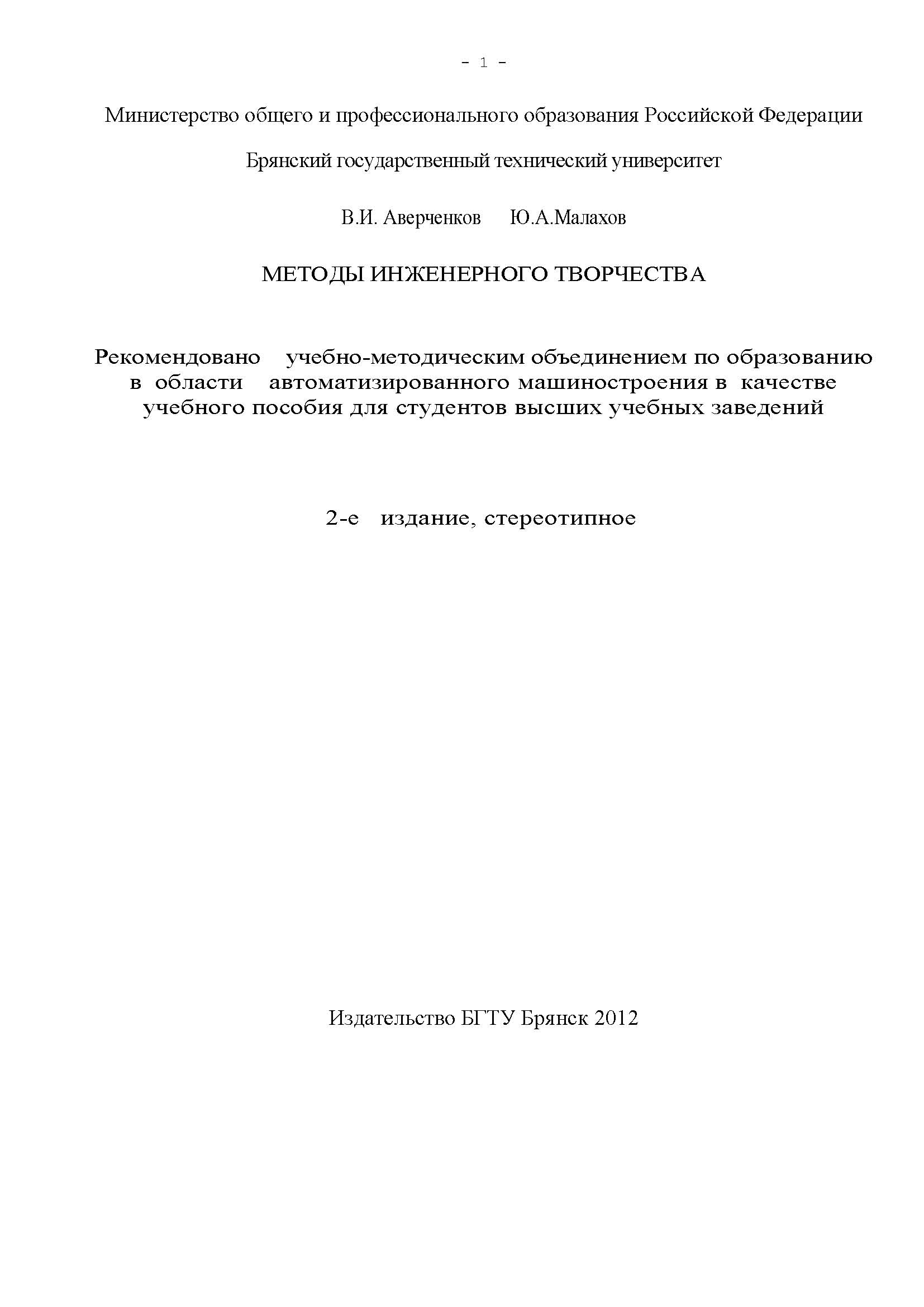Аверченков, В. И. Методы инженерного творчества : учебное пособие / В. И. Аверченков, Ю. А. Малахов. — Брянск : Брянский государственный технический университет, 2012. — 110 c. — ISBN 5-230-02452-6. — Текст : электронный // Цифровой образовательный ресурс IPR SMART : [сайт]. — URL: https://www.iprbookshop.ru/6999.html (дата обращения: 08.09.2025). — Режим доступа: для авторизир. пользователей