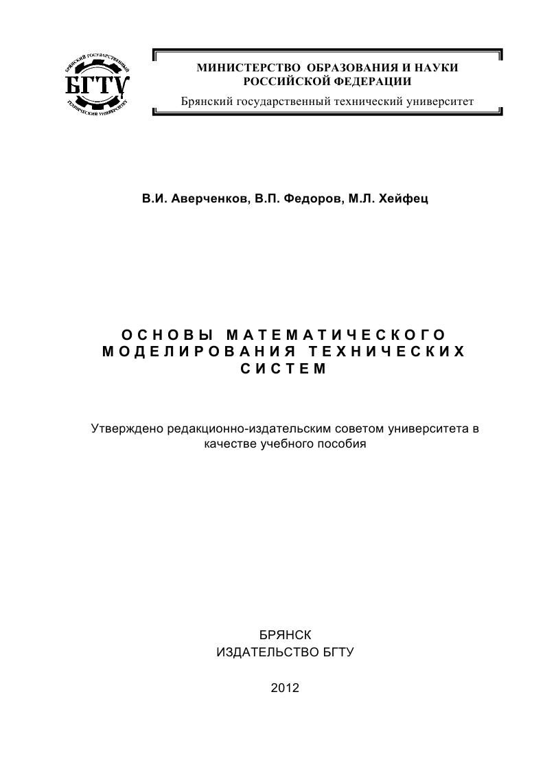 Аверченков В.И. Основы математического моделирования технических систем : учебное пособие / Аверченков В.И., Федоров В.П., Хейфец М.Л.. — Брянск : Брянский государственный технический университет, 2012. — 271 c. — ISBN 5-89838-126-0. — Текст : электронный // Цифровой образовательный ресурс IPR SMART : [сайт]. — URL: https://www.iprbookshop.ru/7003.html (дата обращения: 21.12.2025). — Режим доступа: для авторизир. пользователей