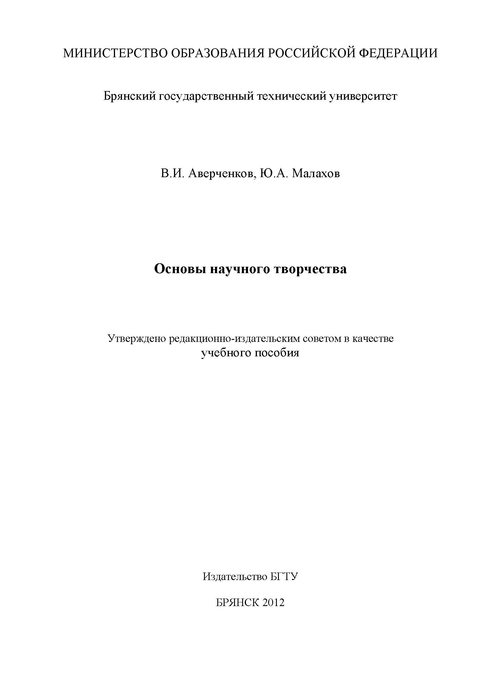 Аверченков, В. И. Основы научного творчества : учебное пособие / В. И. Аверченков, Ю. А. Малахов. — Брянск : Брянский государственный технический университет, 2012. — 156 c. — Текст : электронный // Цифровой образовательный ресурс IPR SMART : [сайт]. — URL: https://www.iprbookshop.ru/7004.html (дата обращения: 04.09.2025). — Режим доступа: для авторизир. пользователей