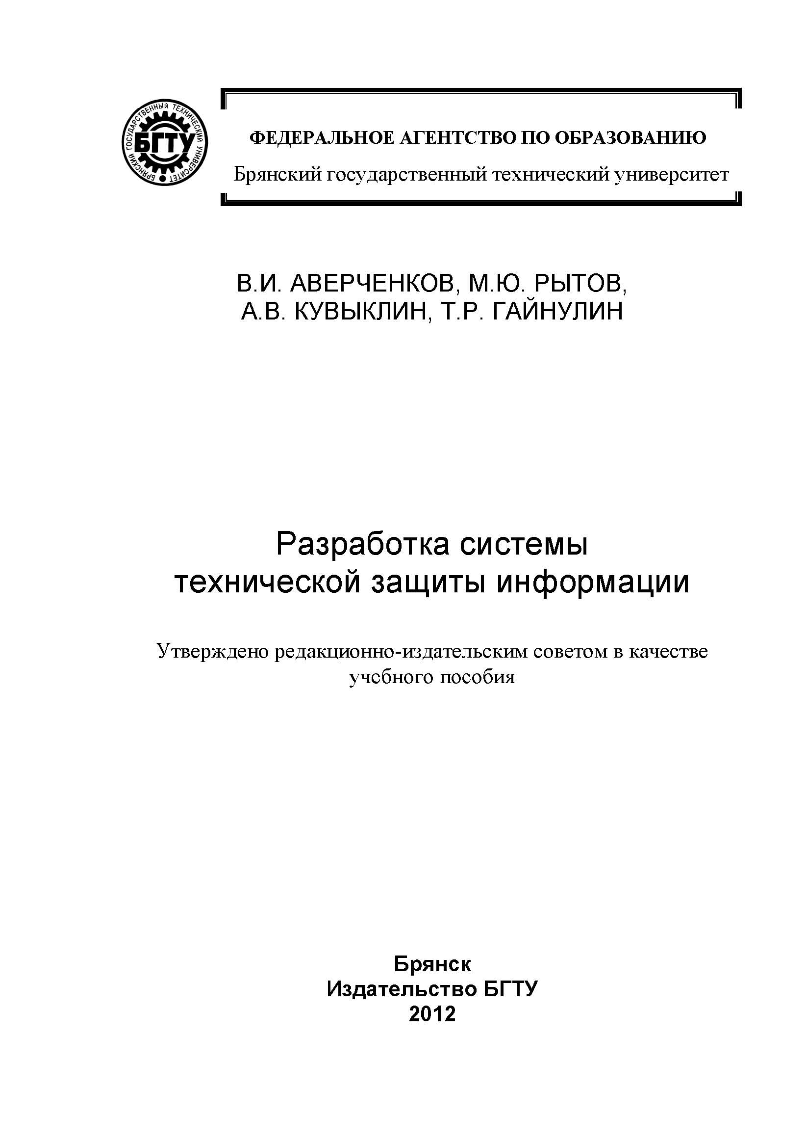Разработка системы технической защиты информации : учебное пособие / В. И. Аверченков, М. Ю. Рытов, А. В. Кувыклин, Т. Р. Гайнулин. — Брянск : Брянский государственный технический университет, 2012. — 187 c. — ISBN 5-89838-358-1. — Текст : электронный // Цифровой образовательный ресурс IPR SMART : [сайт]. — URL: https://www.iprbookshop.ru/7005.html (дата обращения: 25.09.2025). — Режим доступа: для авторизир. пользователей