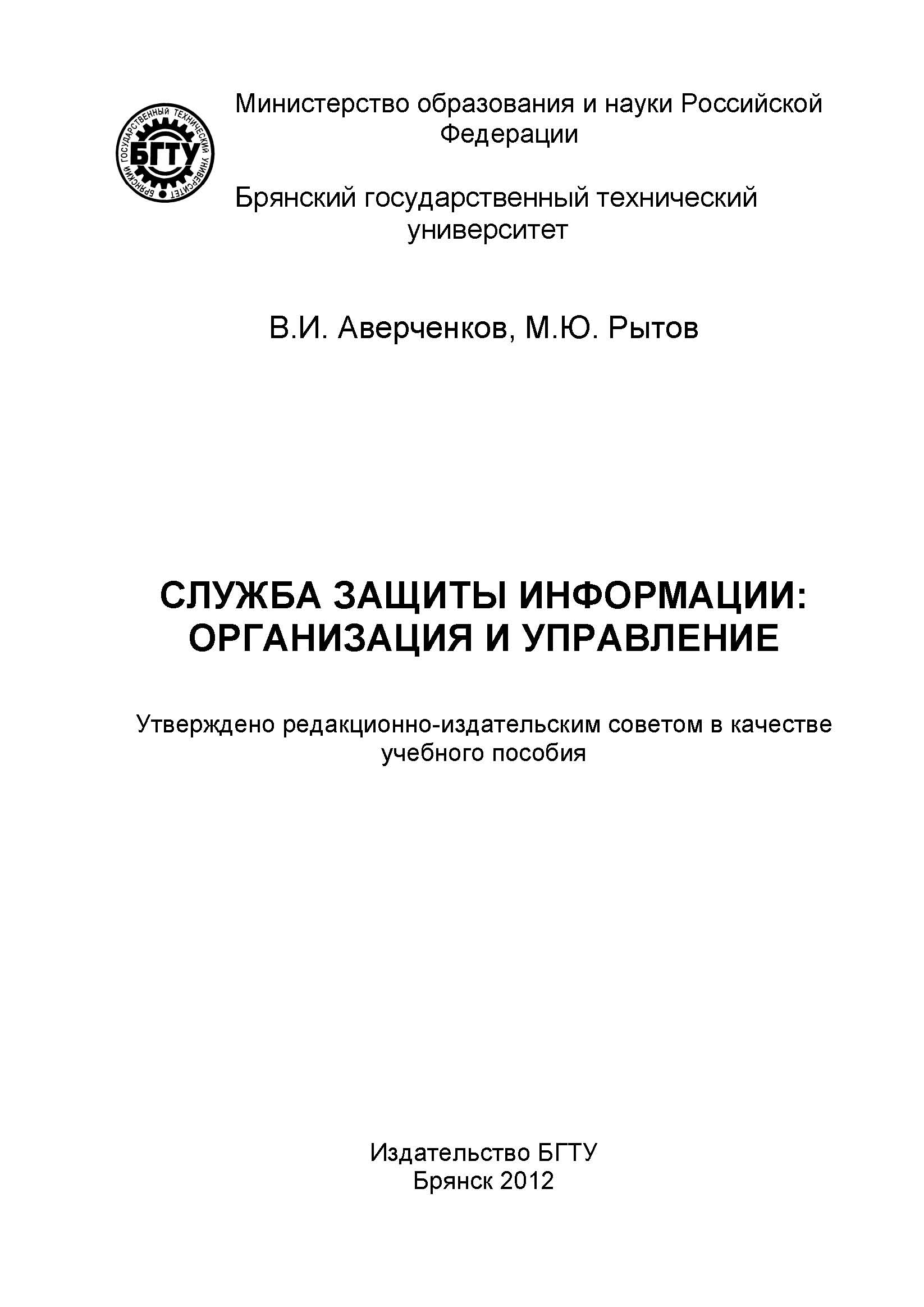 Аверченков, В. И. Служба защиты информации. Организация и управление : учебное пособие для вузов / В. И. Аверченков, М. Ю. Рытов. — Брянск : Брянский государственный технический университет, 2012. — 186 c. — ISBN 5-89838-138-4. — Текст : электронный // Цифровой образовательный ресурс IPR SMART : [сайт]. — URL: https://www.iprbookshop.ru/7008.html (дата обращения: 06.10.2025). — Режим доступа: для авторизир. пользователей