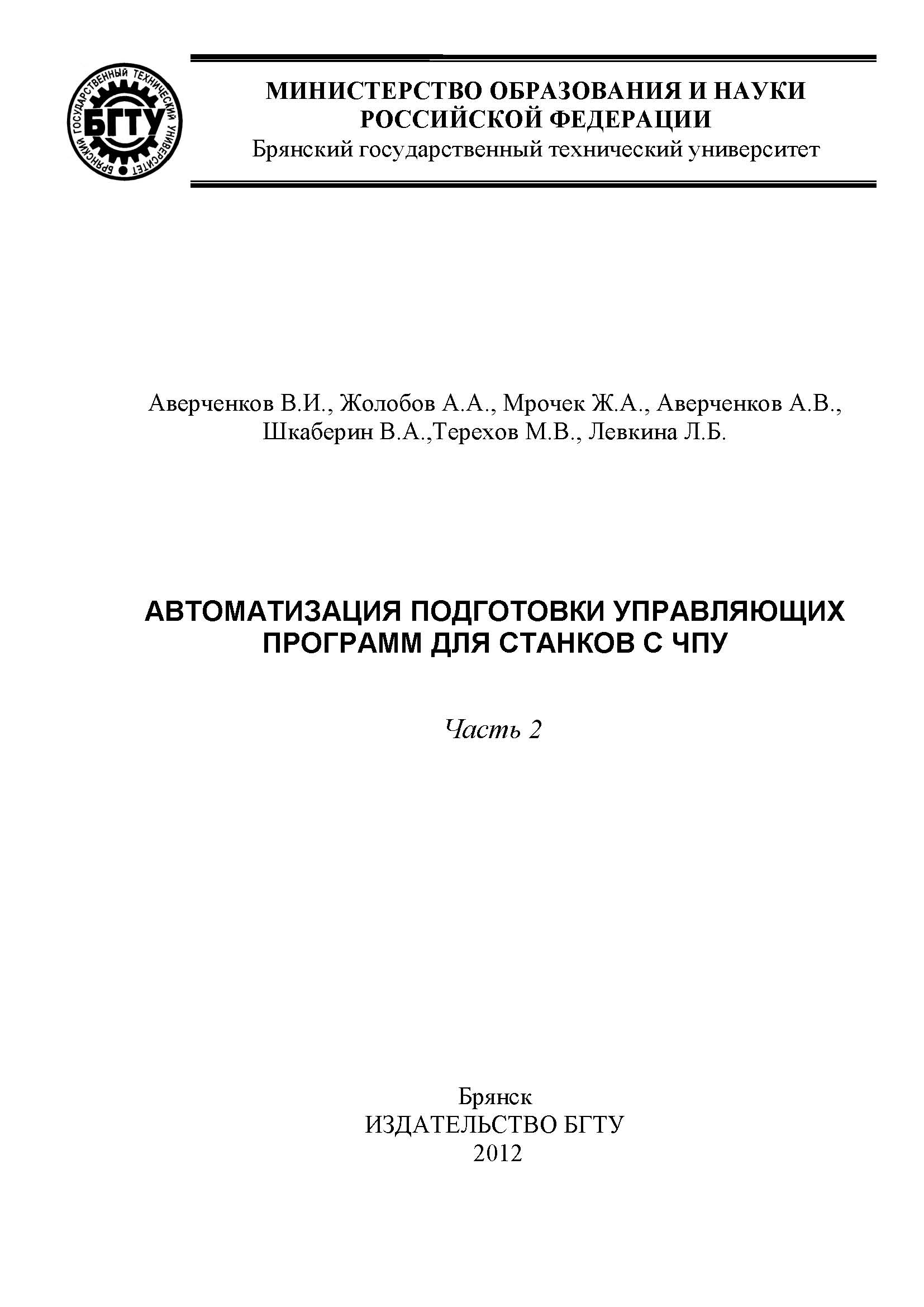 Автоматизация подготовки управляющих программ для станков с ЧПУ. Часть 2 : учебное пособие для вузов / В. И. Аверченков, А. А. Жолобов, Ж. А. Мрочек [и др.]. — Брянск : Брянский государственный технический университет, 2012. — 212 c. — ISBN 978-5-89838-540-2. — Текст : электронный // Цифровой образовательный ресурс IPR SMART : [сайт]. — URL: https://www.iprbookshop.ru/7010.html (дата обращения: 11.07.2025). — Режим доступа: для авторизир. пользователей