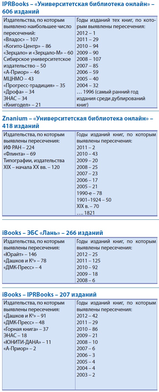 В 2012 г. специалисты библиотеки РГПУ им. А.И. Герцена проводили анализ подписки на ЭБС с точки зрения статистики её использования, в том числе изучая дублетность изданий в ЭБС (когда одно и то же издание было прочитано на разных ЭБС-платформах), что позволило внести коррективы в подписку на 2013 г. При увеличении объёма подписки и после создания подробных пакетов документов по каждой ЭБС было принято решение проанализировать весь массив выписанных изданий в шести ЭБС с целью выявления одних и тех же изданий в разных ЭБС и причин этого явления. При расчётах для каждого издания учитывались (кроме авторов и заглавия) следующие уникальные признаки: год издания, издательство, ISBN.