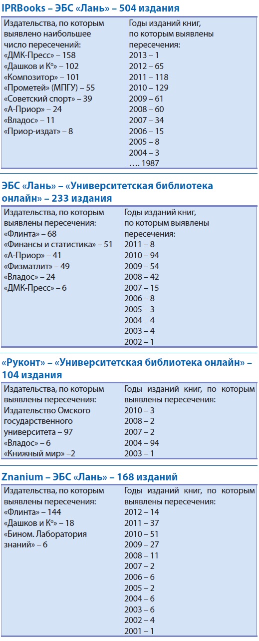 По чтению одних и тех же изданий на разных платформах выделяются следующие пары ЭБС: