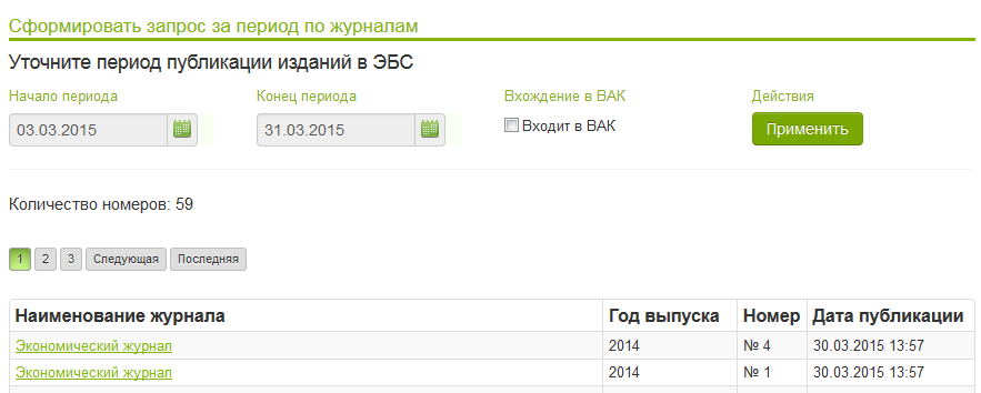 Теперь вы можете получать информацию по новинкам за период не только по книгам, но и по журналам. При запросе информации по умолчанию вы получите результаты поступлений за последнюю неделю, которые будут выведены в виде таблицы. Также вы можете задать любой интересующий отрезок времени и скачать полученную информацию в виде файла.