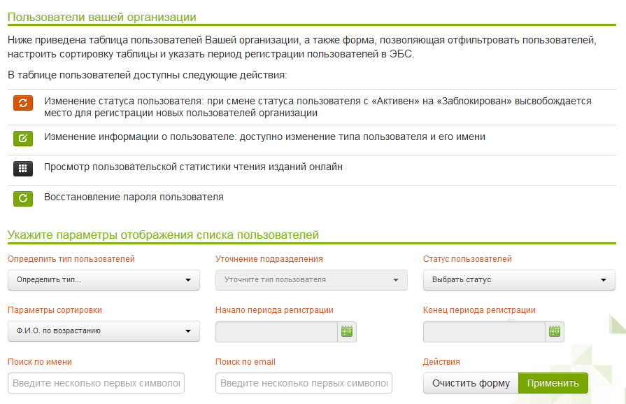 Увидеть всех зарегистрированных пользователей организации можно в личном кабинете библиотеки - при входе в ЭБС IPRbooks (iprbookshop.ru) под логином с окончанием _stat и соответствующим паролем, в разделе «Информация о ваших пользователях. Настройка данных для регистрации/Пользователи вашей организации». Формы, приведенные в этом же разделе, позволяют отфильтровать читателей по самым разным параметрам: по типу пользователя (студент, аспирант, преподаватель), по подразделению вуза, по статусу (активный, заблокированный) и т.д.