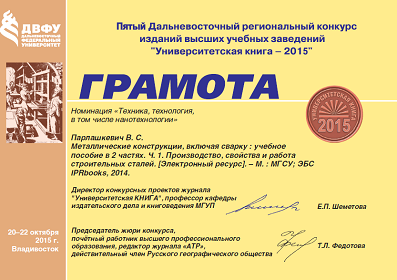 В номинации «Техника, технология, в том числе нанотехнологии» грамоту завоевало издание В.С. Парлашкевича «Металлические конструкции, включая сварку: учебное пособие в 2 частях. Часть 1. Производство, свойства и работа строительных сталей».