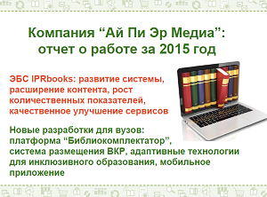 Предлагаем вам ознакомиться с подробной презентацией «Компания “Ай Пи Эр Медиа”: Отчет о работе за 2015 год. ЭБС IPRbooks: развитие системы, расширение контента, рост количественных показателей, качественное улучшение сервисов. Адаптивные технологии для инклюзивного образования. Мобильное приложение. Новые разработки для вузов: платформы Библиокомплектатор и ВКР-ВУЗ».