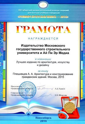 Издательский центр «Ай Пи Эр Медиа» в очередной раз принял участие в конкурсе изданий, на который направлялось несколько учебных пособий, выпущенных на дисках совместно с Национальным исследовательским Московским государственным строительным университетом. В VII Сибирском межрегиональном конкурсе изданий «Университетская книга – 2016», который проводился в г. Новосибирске, участвовали более 40 вузовских издательств и авторов со всей России, было заявлено свыше 100 изданий учебной, учебно-методической и научной литературы. По результатам работы Экспертного совета конкурса издание «Архитектура и конструирование гражданских зданий» (автор: А.А. Плешивцев) было отмечено грамотой в номинации «Лучшее издание по архитектуре, искусству и дизайну».