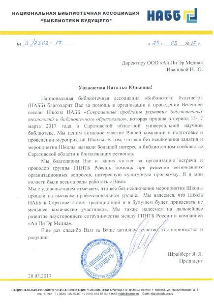 количество участников. Мы также надеемся на дальшнейшее развитие двустороннего сотрудничества между ГПНТБ России и компанией «Ай Пи Эр Медиа», — говорится в благодарственном письме.