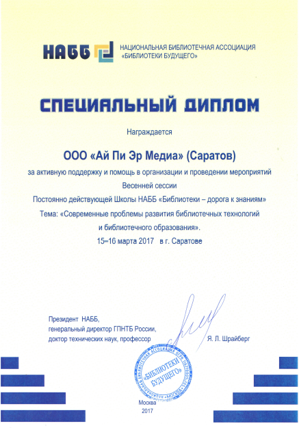 Кроме того, ООО «Ай Пи Эр Медиа» награждено специальным дипломом Национальной библиотечной ассоциации «Библиотеки будущего».