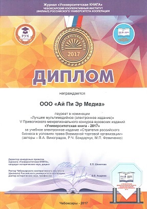 Очередное издание, подготовленное Издательским центром «Ай Пи Эр Медиа», на этот раз совместно с ВГУЮ (РПА Минюста), получило высокую оценку экспертов на межрегиональном конкурсе вузовских изданий. К участию в V Приволжском межрегиональном конкурсе «Университетская книга - 2017», который проводился в г. Новосибирске, было заявлено свыше 200 изданий учебной и научной литературы от более чем 25 издательств и вузов со всей страны. По результатам анализа конкурсных изданий экспертами отмечены высокий уровень редакционно-издательской подготовки, качественное полиграфическое исполнение и художественное оформление изданий, их интересная содержательная составляющая, а издание «Стратегия российского бизнеса в условиях права Всемирной торговой организации» (авторы В.А. Виноградов, Р.Ч. Бондарчук, М.П. Фомиченко) было отмечено дипломом лауреата в номинации «Лучшее мультимедийное (электронное издание)». Высокая оценка нашей работы на очередном межрегиональном конкурсе показывает не только эффективность и результативность деятельности по электронному изданию учебной и научной литературы, но и является залогом качества наших изданий.