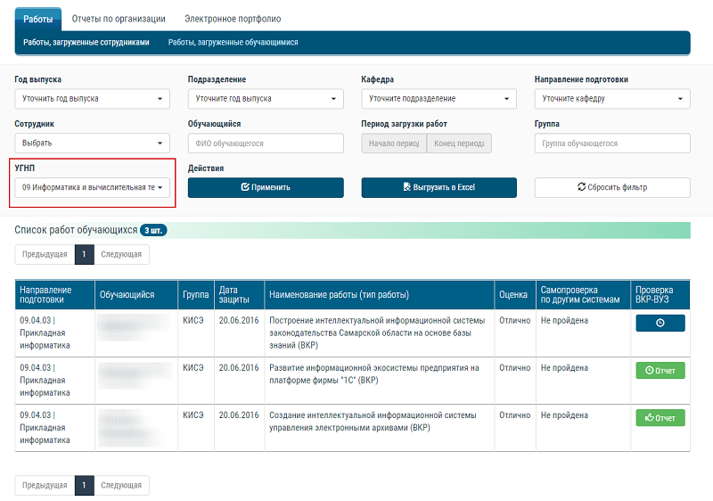 Платформа «ВКР-ВУЗ» постоянно развивается, при этом мы учитываем пожелания ее пользователей. Недавно к уже существующим возможностям фильтрации выпускных квалификационных работ студентов по подразделениям вуза, кафедрам, направлению обучения, периоду загрузки работы на платформу, ФИО конкретного обучающегося, ФИО его научного руководителя, номеру группы обучающегося и ФИО сотрудника, загрузившего работу, добавлена фильтрация по укрупненным группам направлений подготовки и по году окончания обучения студента. Отфильтрованные таким образом результаты можно вывести в сводном табличном виде в документе Microsoft Excel.