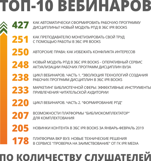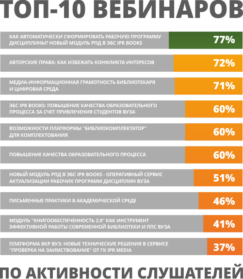 За этот период мы провели свыше 50 вебинаров, в которых приняли участие более 6 000 слушателей — представители руководства вузов, учреждений СПО, сотрудники библиотек, профессорско-преподавательский состав, а также студенты и аспиранты.