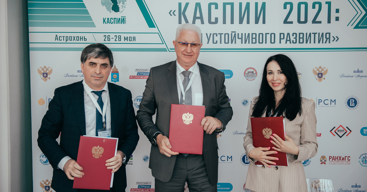 (Слева направо: Ректор ДГТУ Нурмагомед Суракатов, ректору АГУ Константин Маркелов, руководитель ГК IPR MEDIA Наталья Иванова, © фото оргкомитета форума «Каспий 2021»)