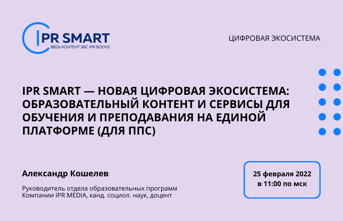 11:00 (МСК) «IPR SMART — новая цифровая экосистема: образовательный контент и сервисы для обучения и преподавания на единой платформе (для ППС)».