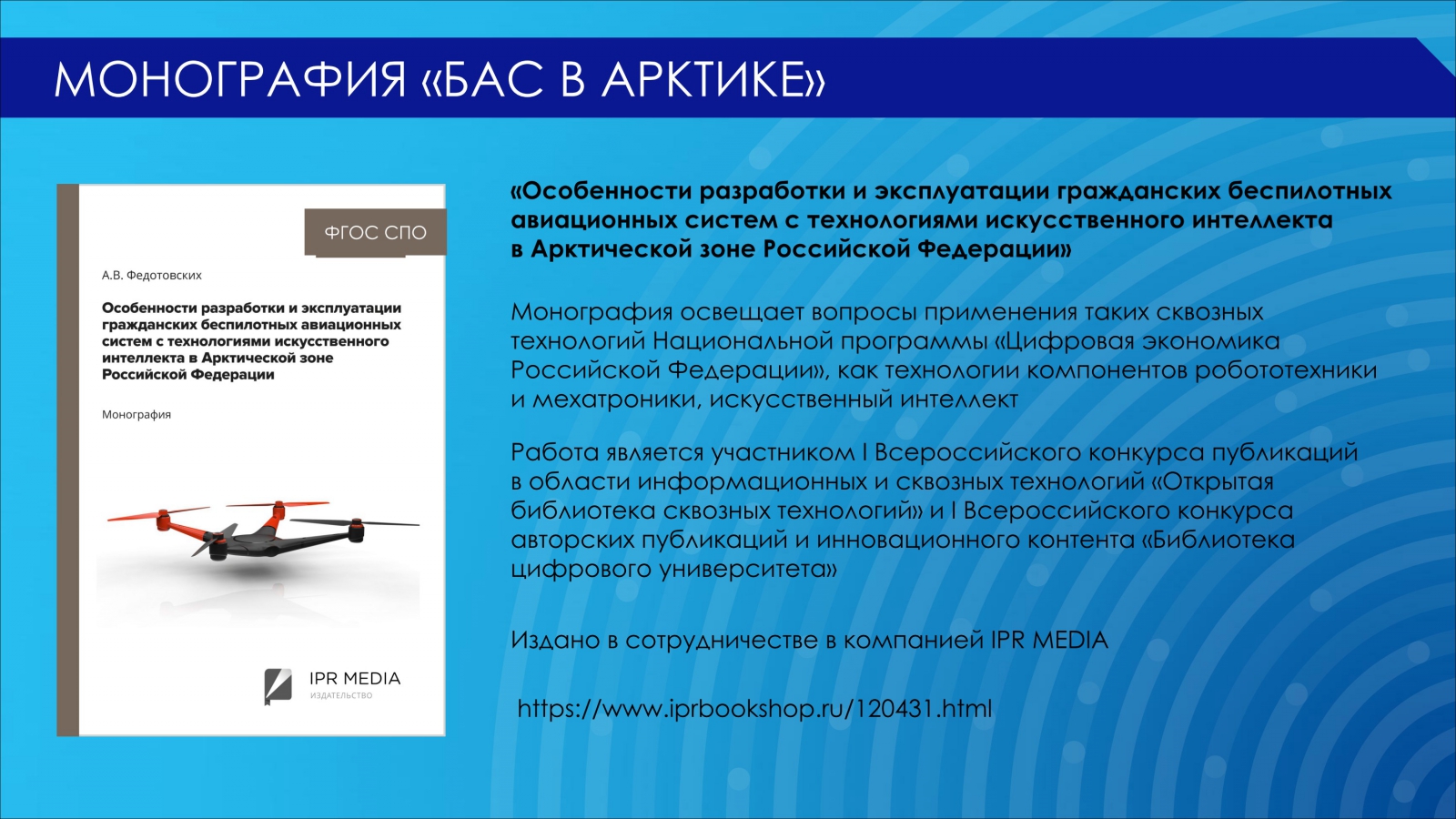 Интерес участников вызвала презентация монографии «Особенности разработки и эксплуатации гражданских беспилотных авиационных систем с технологиями искусственного интеллекта в Арктической зоне Российской Федерации», изданная издательством «Ай Пи Ар Медиа» в 2022 году. Это первая в России комплексная аналитическая работа, посвященная проблемам и возможностям применения летающих беспилотников в суровых условиях Севера. В ней отражены не только опыт разработчиков современных интеллектуальных летающих роботов, но и будущее отрасли, новые профессии и образовательные стандарты. Презентация стала третьим мероприятием, посвященным монографии: первое ее представление состоялось на конференции «Беспилотная авиация 2022», затем автор провел онлайн-лекцию в проекте DATALIB. Лекторий.