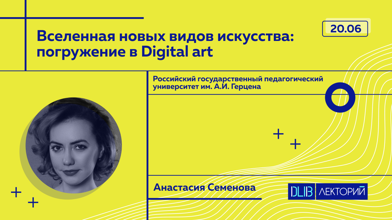 20 июня в 11.00 (МСК) Семёнова Анастасия Алексеевна, кандидат социологических наук, доцент Российского государственного педагогического университета имени А.И. Герцена проведет лекцию по цифровому искусству «Вселенная новых видов искусства: погружение в Digital art».