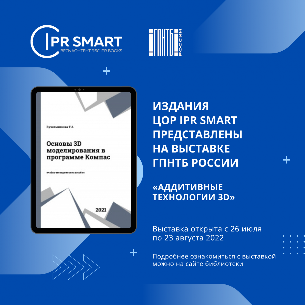 С 26 июля по 23 августа 2022 года в Государственной публичной научно-технической библиотеке России проходит выставка «Аддитивные технологии 3D». При подготовке выставки использовались учебные пособия цифрового образовательного ресурса IPR SMART.