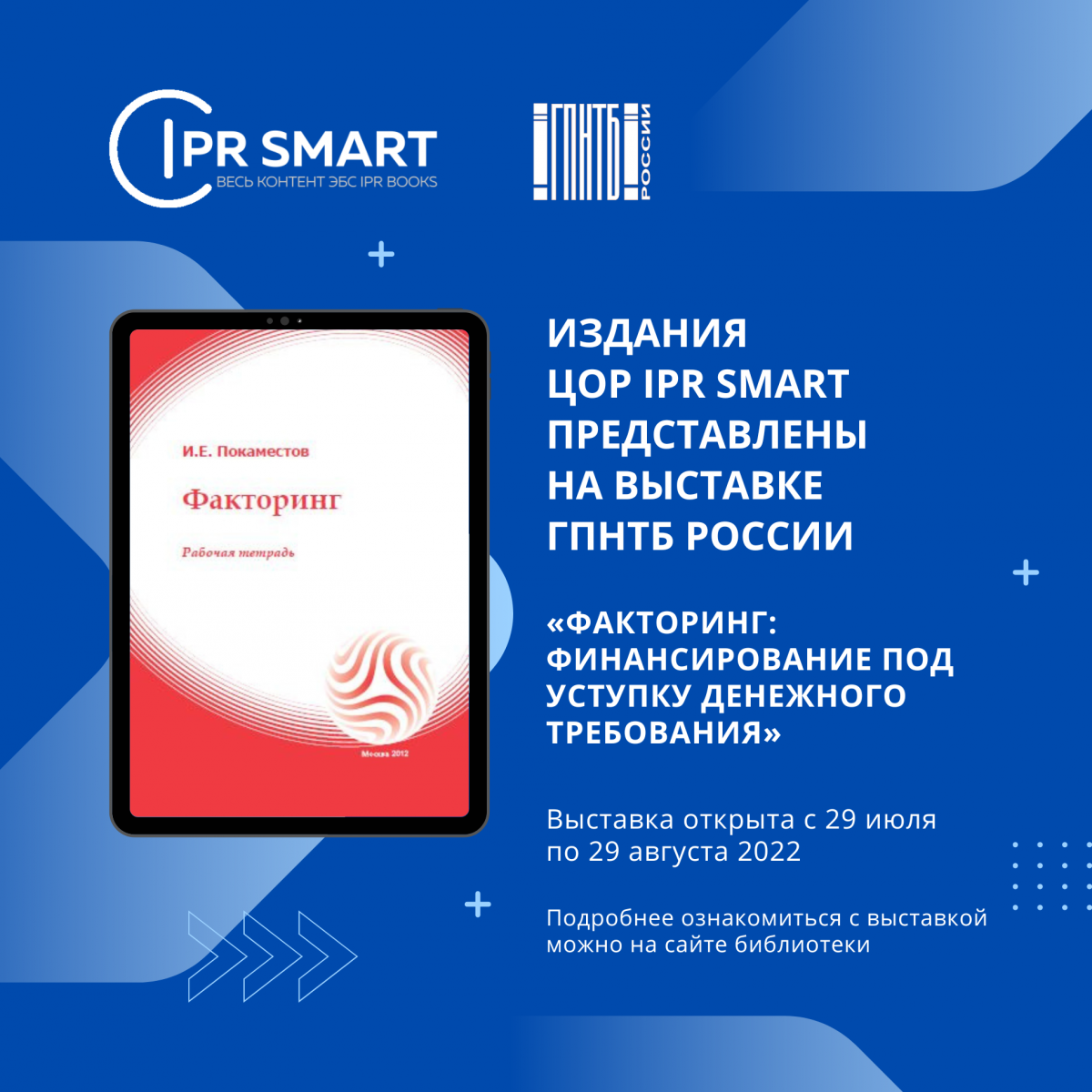 С 29 июля по 29 августа 2022 года в Государственной публичной научно-технической библиотеке России проходит выставка «Факторинг: финансирование под уступку денежного требования». При подготовке выставки использовалась учебная литература, представленная на ЦОР IPR SMART.
