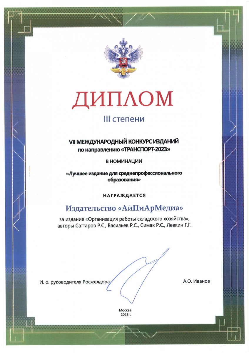 Диплом III степени в номинации «Лучшее издание для среднего профессионального образования» получила книга «Организация работы складского хозяйства» издательства «Ай Пи Ар Медиа», авторами которой выступили Саттаров Р.С., Васильев Р.С, Симак Р.С., Левкин Г.Г.