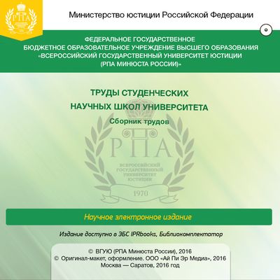 Труды студенческих научных школ университета : сборник трудов / В. Е. Шляхова, В. Г. Нестолий, П. А. Чегоряева [и др.]. — Москва, Саратов : Всероссийский государственный университет юстиции (РПА Минюста России), Ай Пи Эр Медиа, 2016. — 214 c. — ISBN 978-5-00094-347-2. — Текст : электронный // Цифровой образовательный ресурс IPR SMART : [сайт]. — URL: https://www.iprbookshop.ru/72398.html (дата обращения: 27.04.2025). — Режим доступа: для авторизир. пользователей