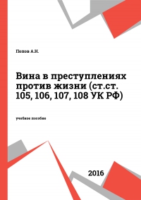 Попов, А. Н. Вина в преступлениях против жизни (ст.ст. 105, 106, 107, 108 УК РФ) : конспект лекций / А. Н. Попов. — Санкт-Петербург : Санкт-Петербургский юридический институт (филиал) Академии Генеральной прокуратуры РФ, 2016. — 126 c. — Текст : электронный // Цифровой образовательный ресурс IPR SMART : [сайт]. — URL: https://www.iprbookshop.ru/73004.html (дата обращения: 17.07.2023). — Режим доступа: для авторизир. пользователей