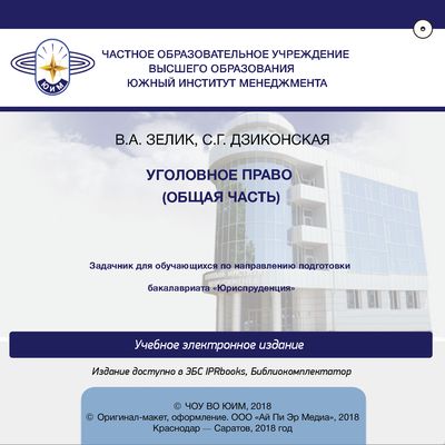 Зелик, В. А. Уголовное право (общая часть) : задачник для обучающихся по направлению подготовки бакалавриата «Юриспруденция» / В. А. Зелик, С. Г. Дзиконская. — Краснодар, Саратов : Южный институт менеджмента, Ай Пи Эр Медиа, 2018. — 47 c. — Текст : электронный // Цифровой образовательный ресурс IPR SMART : [сайт]. — URL: https://www.iprbookshop.ru/73118.html (дата обращения: 02.09.2025). — Режим доступа: для авторизир. пользователей